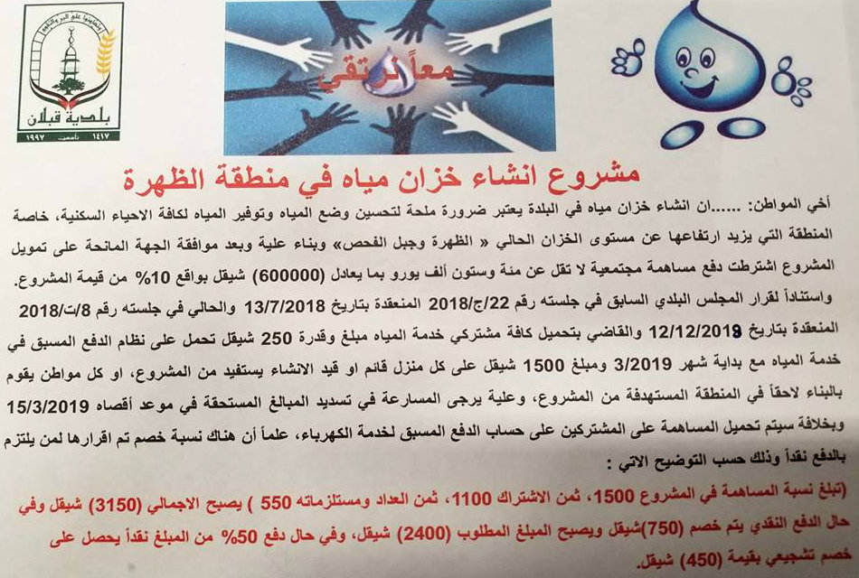 بلدية قبلان تنشر إعلاناً بشأن إنشاء خزان مياه وتحدد 15.03.2019، موعداً أخيراً لتسديد المبالغ المستحقة.