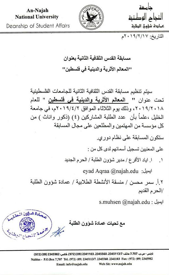 جامعة النجاح: دعوة للمشاركة بمسابقة القدس الثقافية
