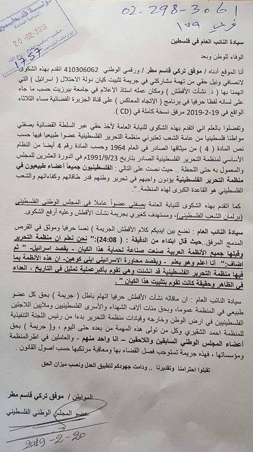 عضو المجلس الوطني موفق مطر يقدم شكوى للنيابة العامة ضد رئيس دائرة الإعلام في جامعة بيرزيت نشأت الأقطش، عقب ظهوره على قناة الجزيرة في برنامج الاتجاه المعاكس.