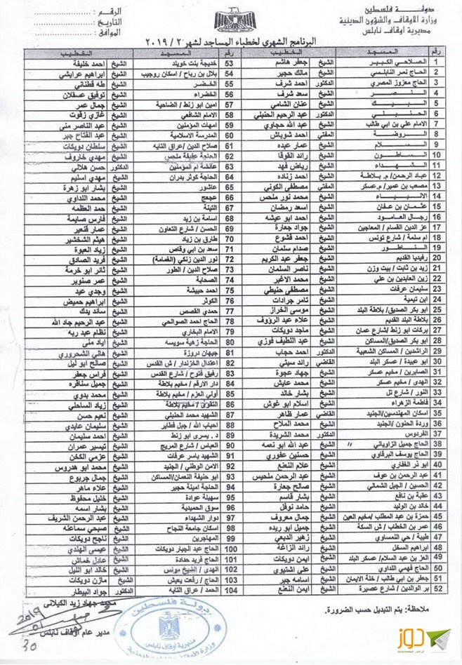 خطباء صلاة الجمعة في مساجد مدينة نابلس وضواحيها ليوم الجمعة 22.02.2019.