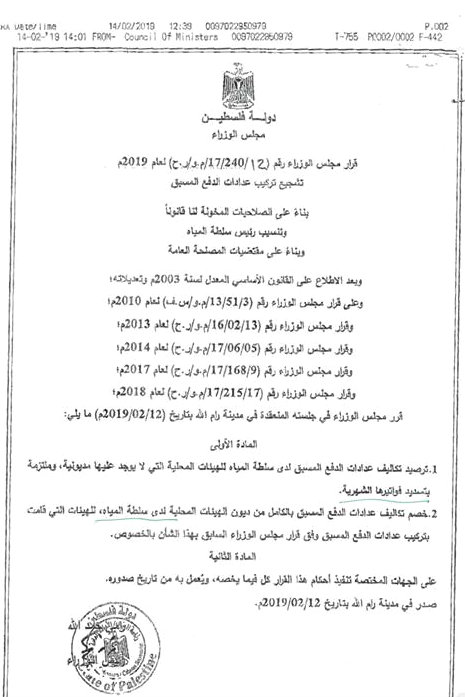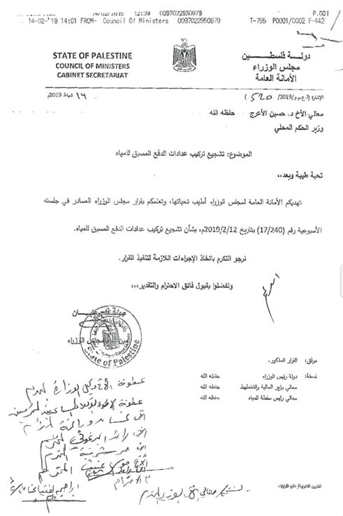 * مرفق قرار مجلس الوزراء بشأن تركيب عدادات الدفع المسبق للمياه: