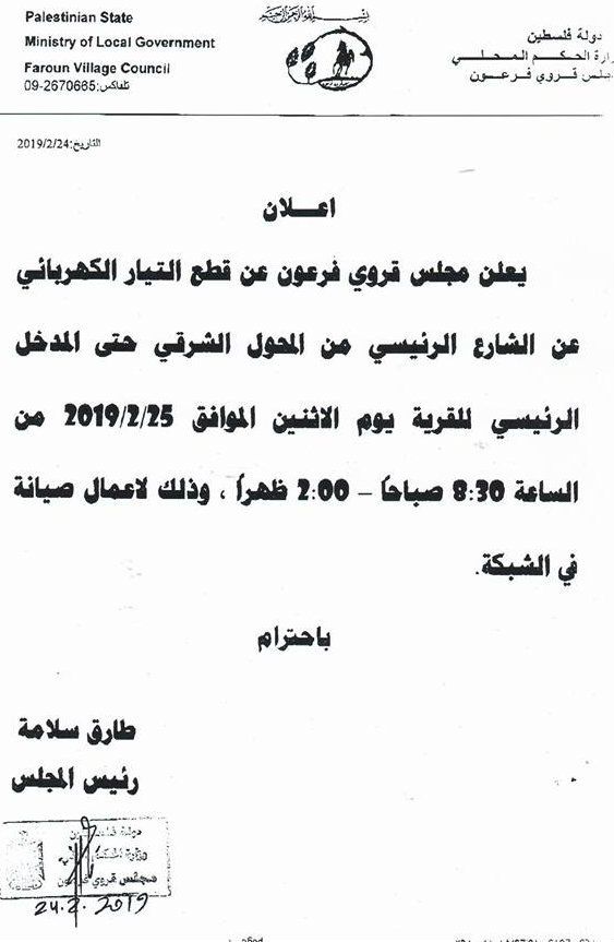 لأعمال الصيانة في الشبكة، مجلس قروي فرعون يعلن عن فصله للتيار الكهربائي لعدة ساعات يوم الاثنين.