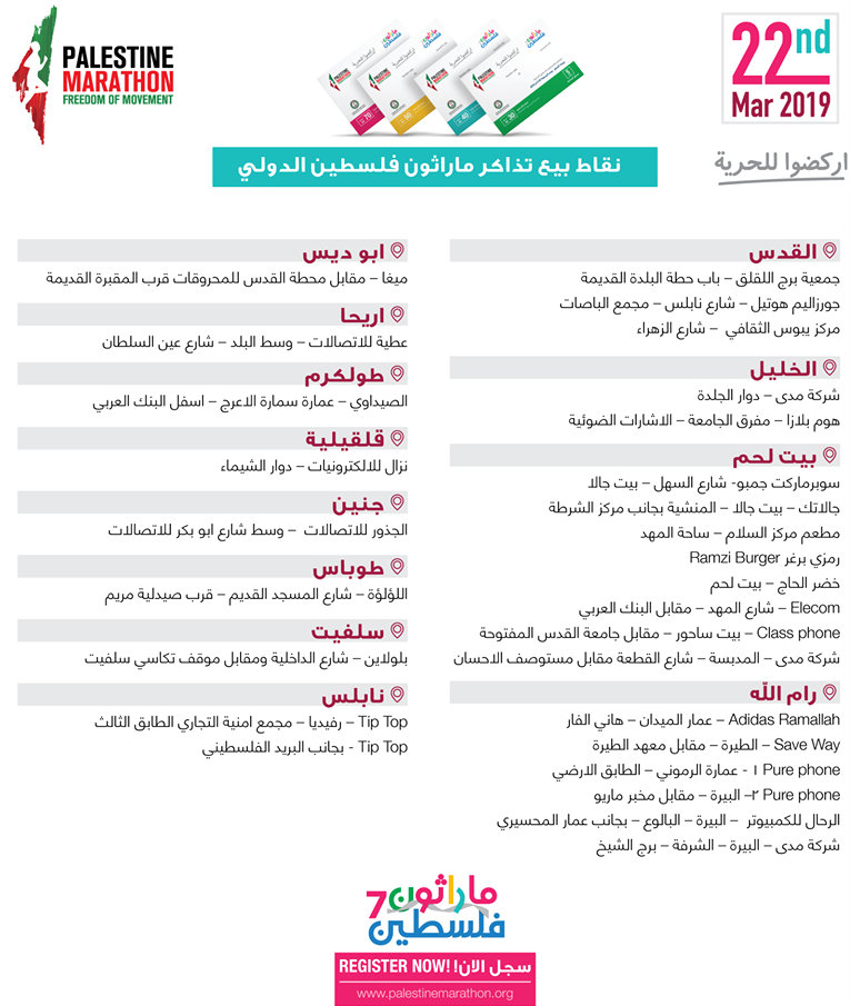 ماراثون فلسطين ينشر قائمة نقاط بيع تذاكر الماراثون، حيث إن باب التسجيل سيغلق في 08.03.2019.