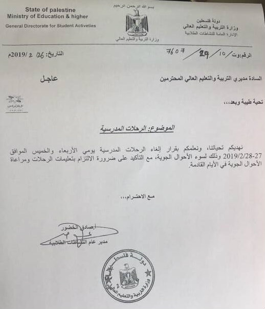 مدرية التربية والتعليم في نابلس تعلن عن إلغاء الرحلات المدرسية ليومين بسبب الظروف الجوية.