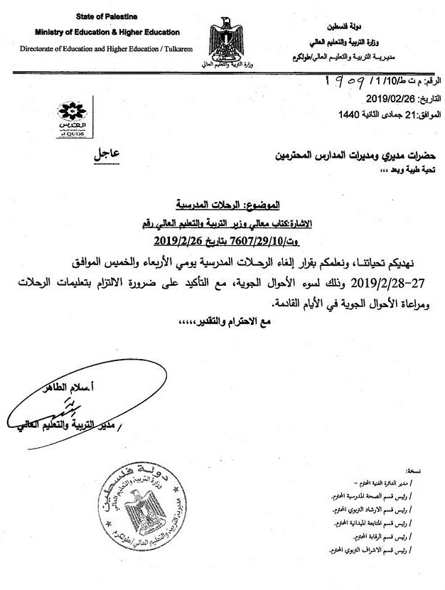 مديرية التربية والتعليم في طولكرم تقرر إلغاء الرحلات المدرسية لليومين القادمين بسبب الظروف الجوية.