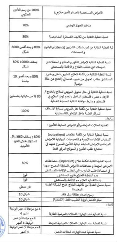 "لاحقا للتعميم السابق بخصوص تنفيذ نظام التأمين الصحي المعتمد من الهيئة العامة في العام 2018، وعلى ضوء ما توصلت إليه لجنة التأمين الصحي بالتعاون مع مجلس النقابة من حيث التنفيذ الأمثل للنظام ضمن المعطيات المتاحة فقد قرر مجلس النقابة في جلسته المنعقدة بتاريخ 26/2/2019 ما هو آت:
