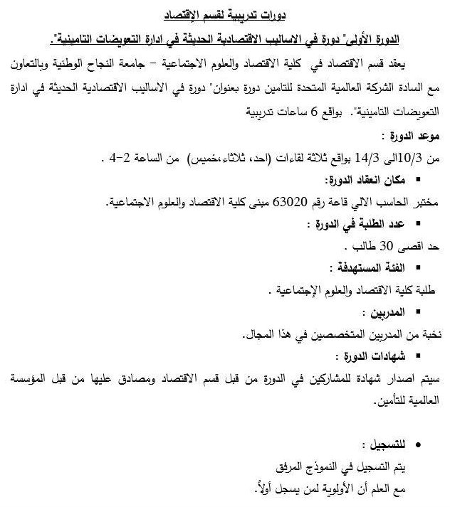 كلية الاقتصاد والعلوم الاجتماعية في جامعة النجاح تعلن عن عقد دورة تدريبية في إدارة التعويضات التأمينية.