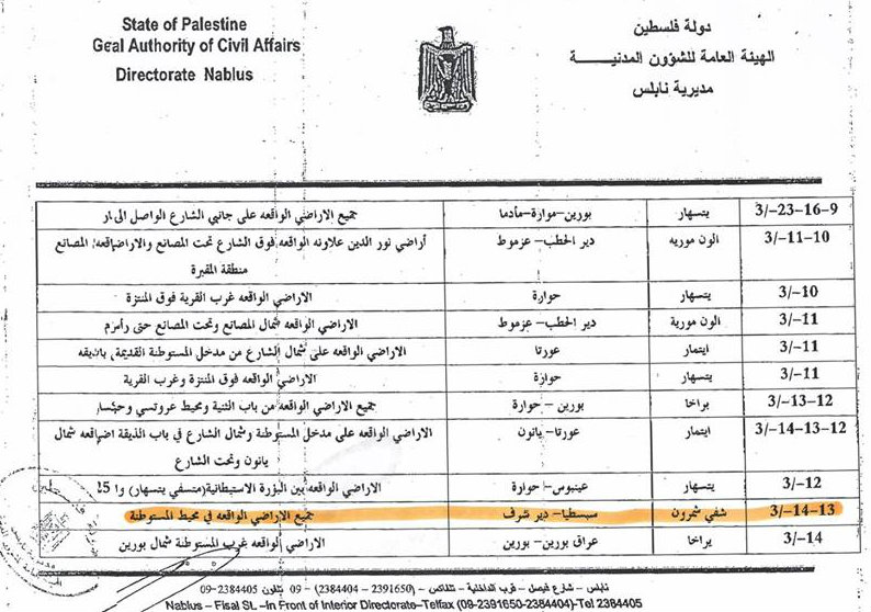 أعلن مجلس قروي دير شرف وللمرة الثانية أنه وحسب ما ورد من الهيئة العامة للشؤون المدنية، فإن موعد حراثة الأراضي المحيطة بمستوطنة شافي شمرون سيكون يومي 13/14.03.2019.