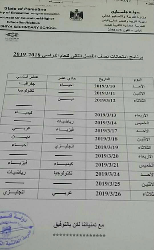 مدرسة العائشية الثانوية للبنات في نابلس تنشر برنامج امتحانات نصف الفصل الثاني.
