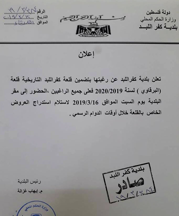 بلدية كفر اللبد تعلن عن موعد استدراج العروض بخصوص تضمين قلعة البرقاوي التاريخية.