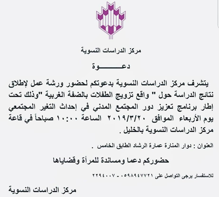 مركز الدراسات النسوية يعلن عن موعد إطلاق نتائج دراسة واقع تزويج الطفلات بالضفة الغربية، ضمن تعزيز دور المجتمع المدني في التغيير.