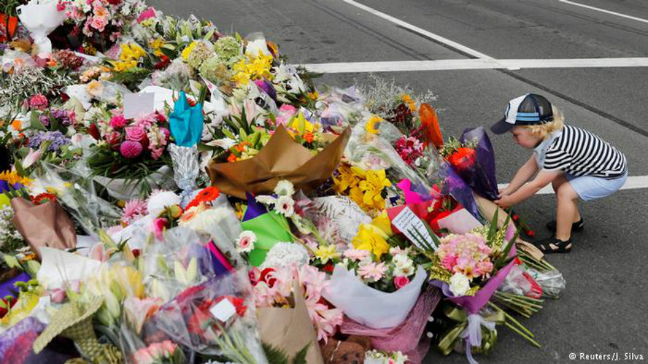 في مفترق طرق، ضُرِبَ حوله طوق أمني، على بعد أمتار قليلة من مسجد "النور"، أحد المسجدين اللذين شهدا الهجوم الدموي على يد الإرهابي المسلح برينتون تارانت، وقف حشد من الناس في لحظات صمت، في حين تقدم آخرون ليضعوا الزهور أو بطاقات التعازي، على أحد النصب التذكارية المؤقتة التي أقيمت في أنحاء المدينة. السماء ملبدة بالغيوم، والهواء مفعم برائحة الزهور، وتنحني فتاتان على بعضهما بعضٍ وتحاولان إضاءة شمعتين. وبطول شارع "دين أفينيو"، الملاصق لإحدى الحدائق، يمكن فقط رؤية قبة المسجد بلونها النحاسي من خلف الطوق الأمني.