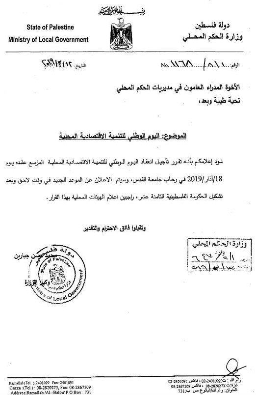وزارة الحكم المحلي تعلن عن تأجيل فعاليات اليوم الوطني للتنمية الاقتصادية.