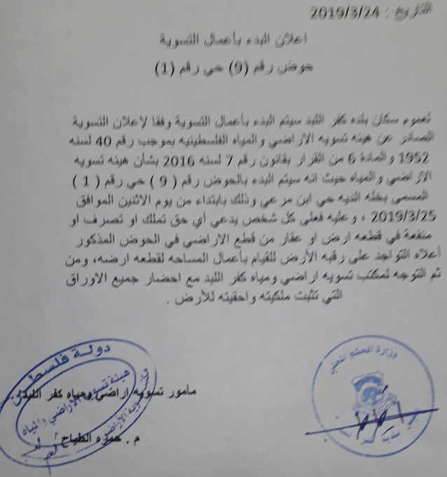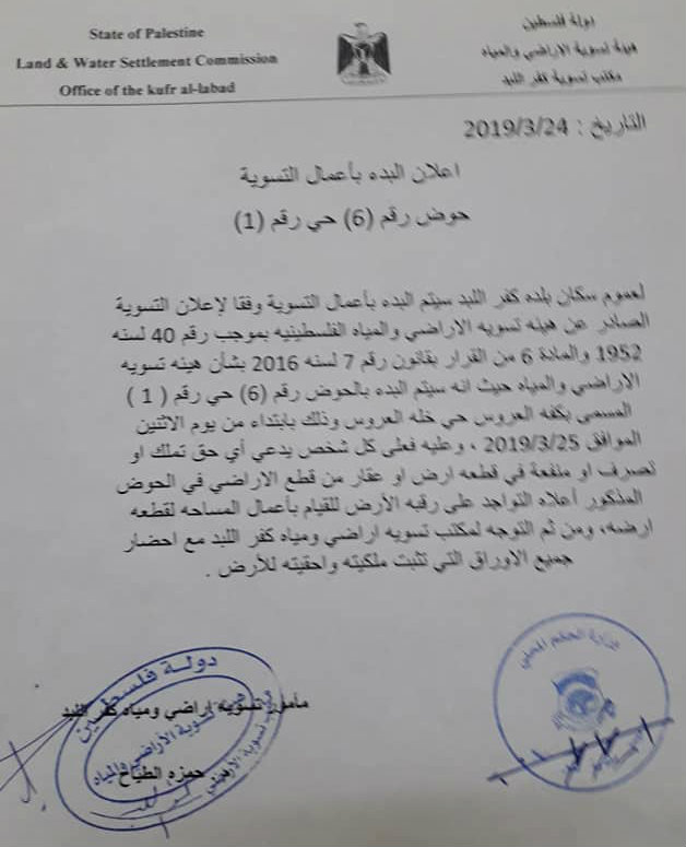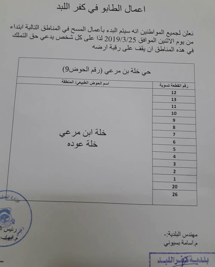 "إلى عموم أهالي كفر اللبد ستبدأ أعمال المساحة يوم الاثنين 25.03.2019، في حي خلة بن مرعي الواقع للشمال من الخلال وحي خلة العروس الواقع للجنوب من عزبة أبو خميش لذا على كل شخص يدعى حق التملك في هذه المناطق أن يقف على رقبة أرضه".