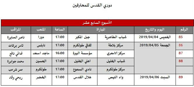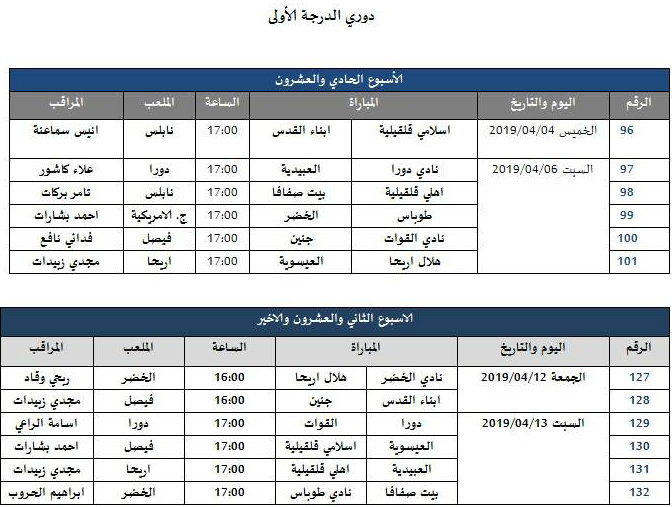 أعلن الاتحاد الفلسطيني لكرة القدم، يوم الأحد 31.03.2019، عن جدول مباريات الأسبوع السابع عشر لدوري القدس للمحترفين برعاية "أوريدو"، وجدول الأسبوعين الـ21 والـ22 لدوري الدرجة الأولى، كالتالي: