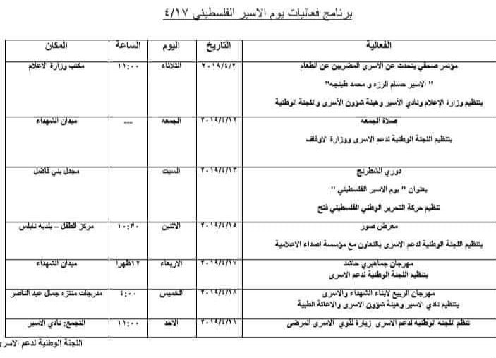 بمناسبة يوم الأسير في السابع عشر من أبريل/ نيسان، اللجنة الوطنية لدعم الأسرى تنشر برنامج فعالياتها بنابلس.