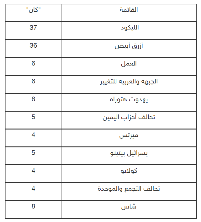 القوائم العربية تخسر ثلاثة مقاعد مقارنة بالانتخابات السابقة واليمين الإسرائيلي بزعامة بنيامين نتينياهو يفوز بفارق 10 مقاعد ويحصل على أغلبية مريحة لتشكيل حكومة بمشاركة أحزاب يمينية متطرفة.