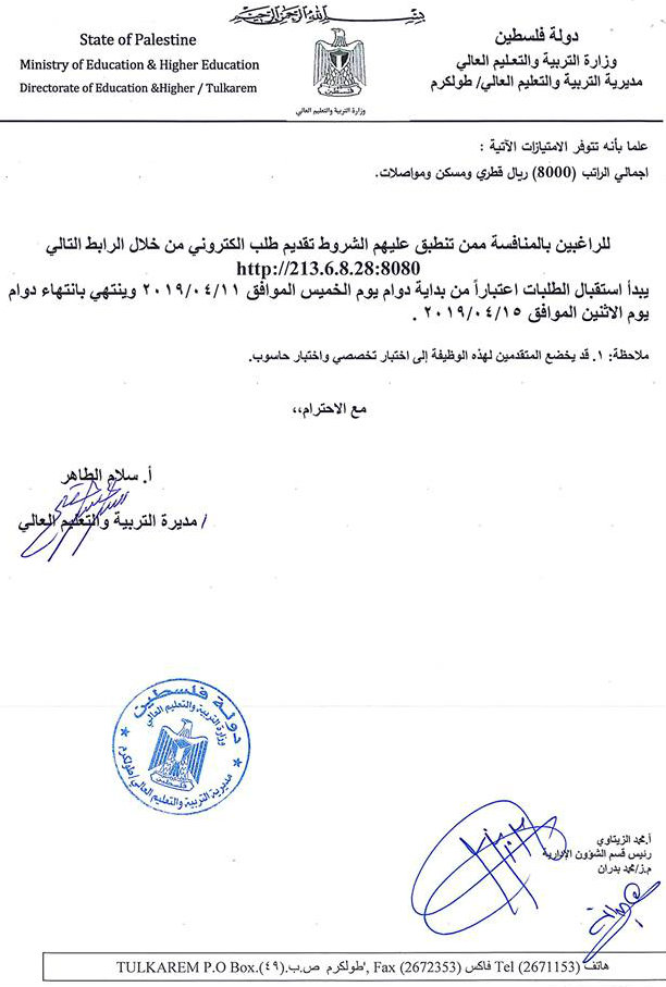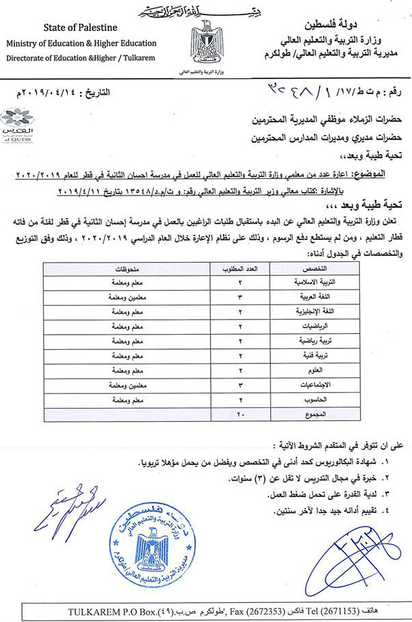 مديرية التربية والتعليم في طولكرم تعلن عن إعارة عدد من معلمي الوزارة للعمل في مدرسة إحسان الثانية في قطر.
