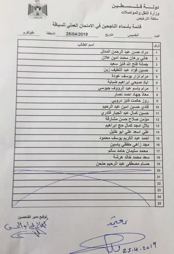 مديرية النقل والمواصلات في طولكرم تنشر نتائج امتحان السياقة العملي.