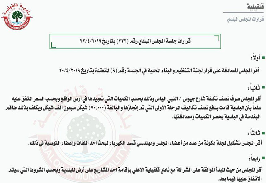 قرارات المجلس البلدي في قلقيلية
