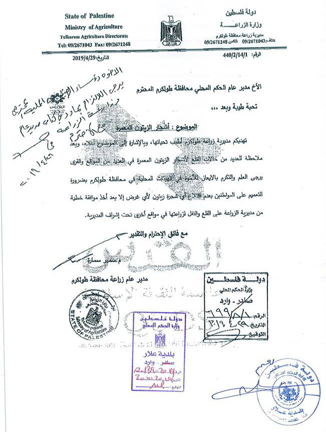 مديرية زراعة طولكرم تنشر تعميماً بشأن عدم قطع أشجار الزيتون إلا بإذن من المديرية.