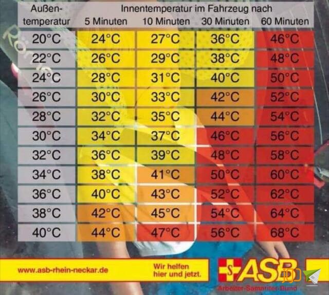 هذا الجدول أدناه باللغة الألمانية يظهر خطورة ترك طفل داخل سيارة وكيف تتضاعف درجات الحرارة خلال فترة قصيرة: