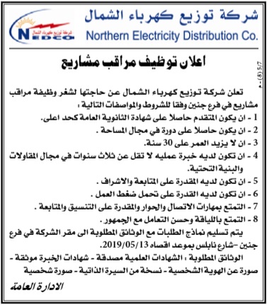 وظيفة شاغرة في شركة توزيع كهرباء الشمال