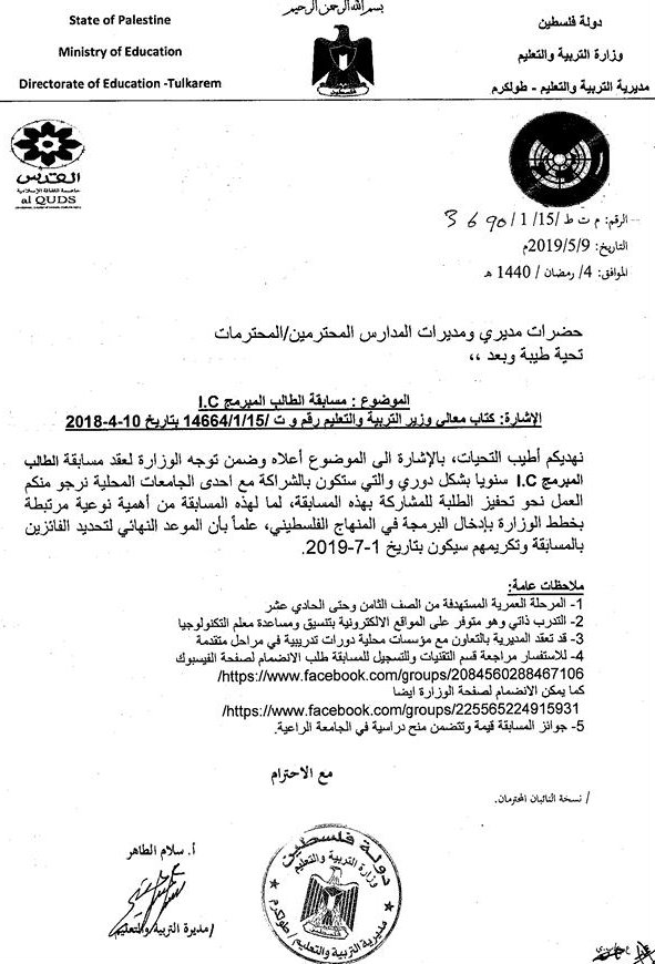 مديرية تربية طولكرم تعلن فتح باب التسجيل لطلبة المدارس للمشاركة في مسابقة الطالب المبرمج IC.