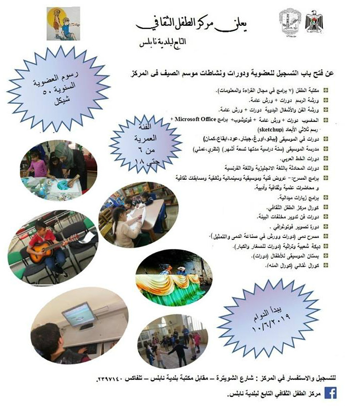 مركز الطفل الثقافي التابع لبلدية نابلس يفتح باب التسجيل لدوراته ونشاطاته خلال موسم الصيف.