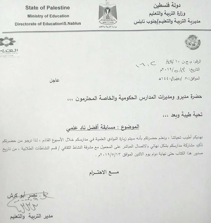 مديرية التربية والتعليم جنوب نابلس تدعو مدارس المنطقة للمشاركة في مسابقة أفضل ناد علمي.