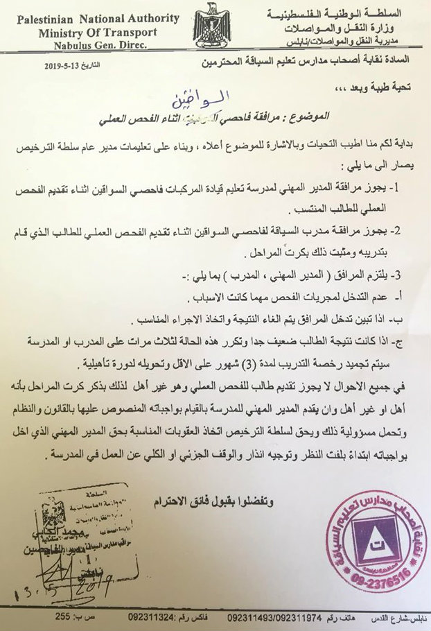 نقابة أصحاب مدارس تعليم السياقة في نابلس تنشر تعليمات وردتها من سلطة الترخيص بشأن مرافقة فاحصي السواقين أثناء الفحص العملي.