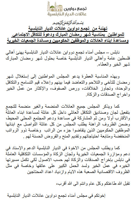 تجمع دواوين عائلات الديار النابلسية يصدر بيانا يناشد فيه تعزيز التكافل الاجتماعي ودعم الموظفين الحكوميين خلال شهر رمضان، خاصة وأنهم لا يتقاضون رواتبهم كاملة للشهر الثالث على التوالي.