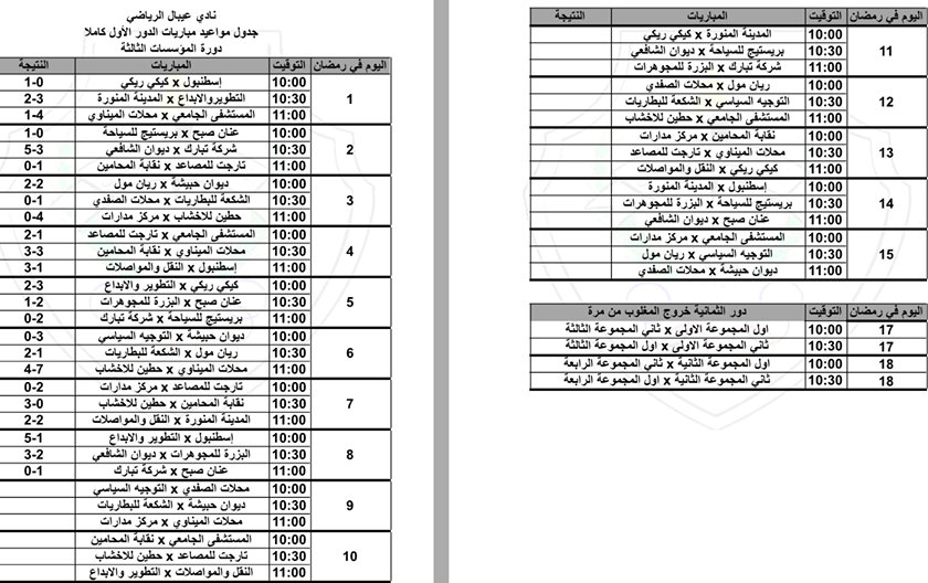 نتائج اليوم الثامن من بطولة المؤسسات لنادي عيبال.