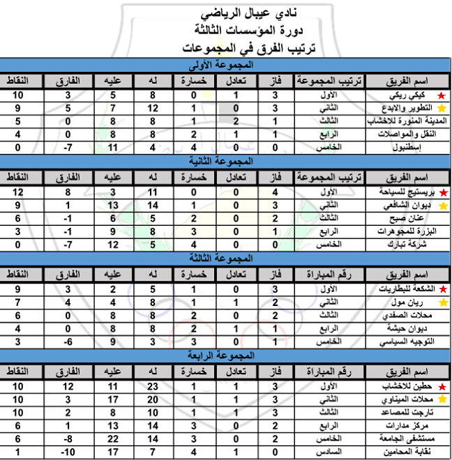 نادي عيبال الرياضي ينشر ترتيب الفرق في الدور الأول مع النقاط في بطولة المؤسسات الثالثة في نابلس.