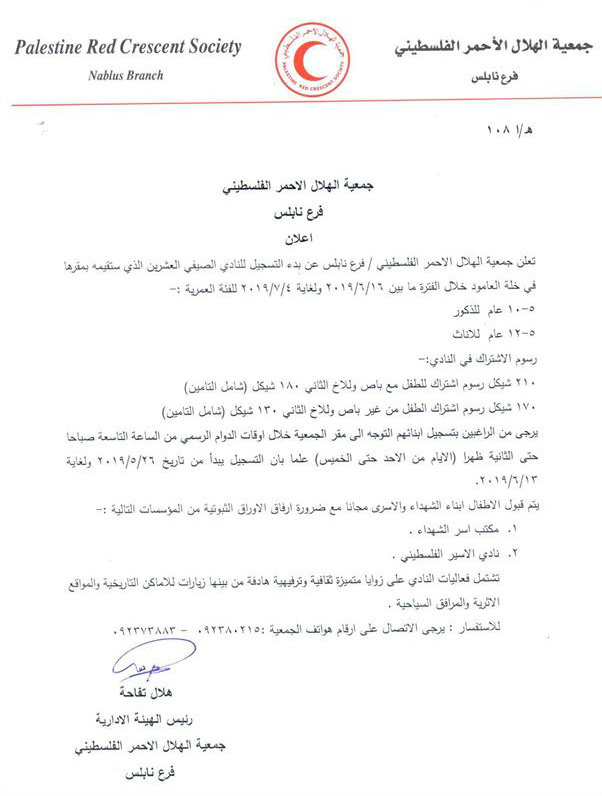 جمعية الهلال الأحمر بنابلس تدعو للمشاركة في ناديها الصيفي ضمن شروط محددة.