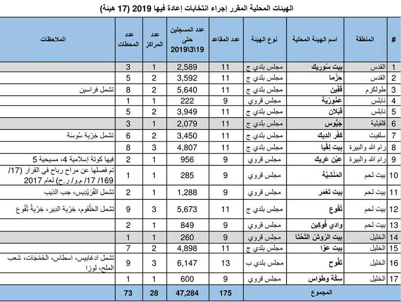 تسلمت لجنة الانتخابات المركزية قرار مجلس الوزراء الصادر يوم 20.05.2019، والذي يقضي بإجراء انتخابات لمجالس ثلاث هيئات محلية بالضفة الغربية وهي: بيت سوريك في محافظة القدس، وجيوس في محافظة قلقيلية، وبيت الروش التحتا في محافظة الخليل. وقد جرى إضافة هذه الهيئات الثلاث إلى الهيئات المحلية الأربع عشرة، والتي قرر مجلس الوزراء بتاريخ 6 أيار إجراء انتخابات إعادة فيها يوم 13 تموز المقبل.
