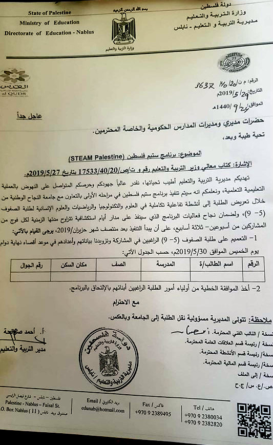 مديرية التربية والتعليم في نابلس تعلن عن بدء تنفيذ برنامج ستيم فلسطين في المدارس.