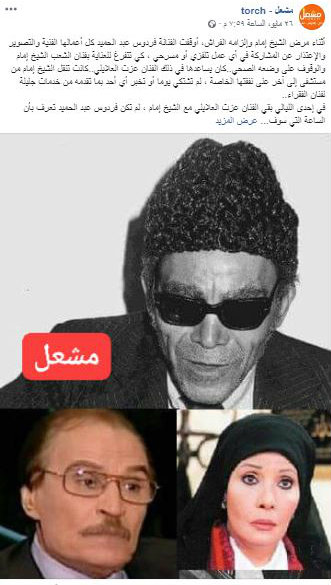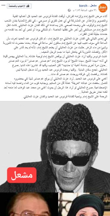 وذكرت صفحة "مشعل" أيضا، "أنه أثناء مرض الشيخ إمام وإلزامه الفراش، أوقفت الفنانة فردوس عبد الحميد كل أعمالها الفنية والتصوير واعتذرت عن المشاركة في أي عمل تلفزيوني أو مسرحي، كي تتفرغ للعناية بفنان الشعب الشيخ إمام والوقوف على وضعه الصحي وكان يساعدها في ذلك الفنان عزت العلايلي. وأن تنقلات الشيخ إمام من مستشفى إلى آخر كان على نفقتها الخاصة ولم تشتكي يوما أو تخبر أي أحد بما تقدمه من خدمات جليلة لفنان الفقراء".