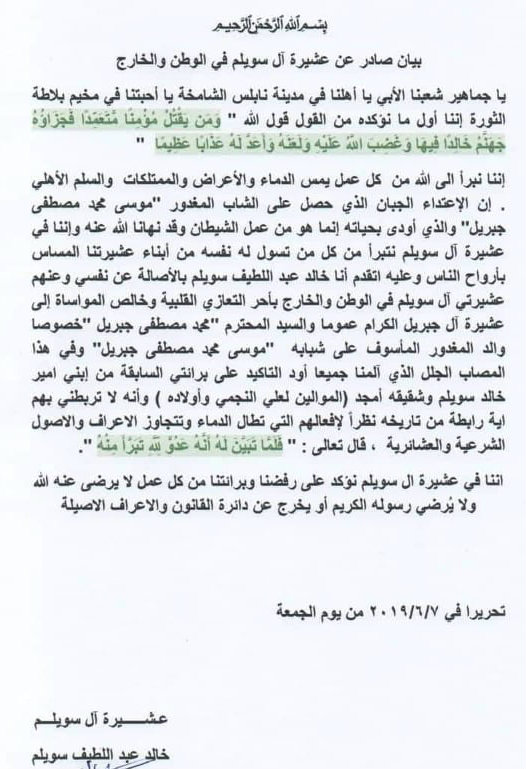 عائلة سويلم تعلن براءتها من قتلة الشاب موسى جبريل من مخيم بلاطة بنابلس.