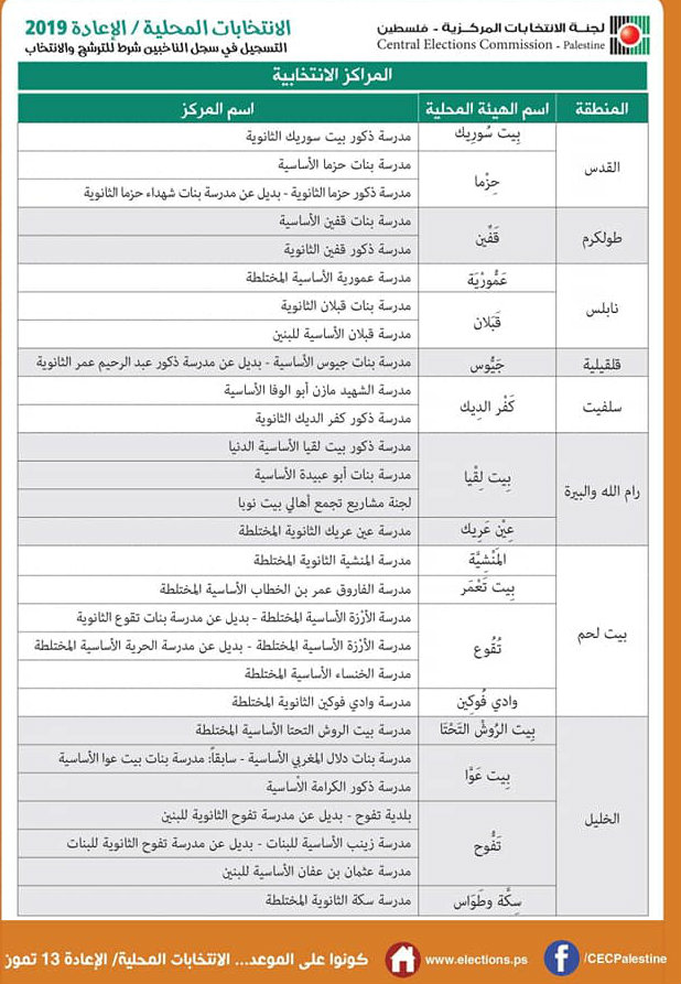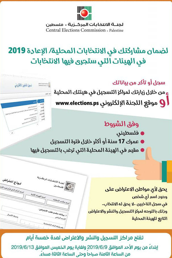 أعلنت لجنة الانتخابات المركزية، الأحد 09.06.2019، عن بدء أولى مراحل انتخابات الإعادة لسبعة عشر هيئة محلية في الضفة الغربية، من المقرر أن تجري الانتخابات فيها بتاريخ 13 تموز المقبل.