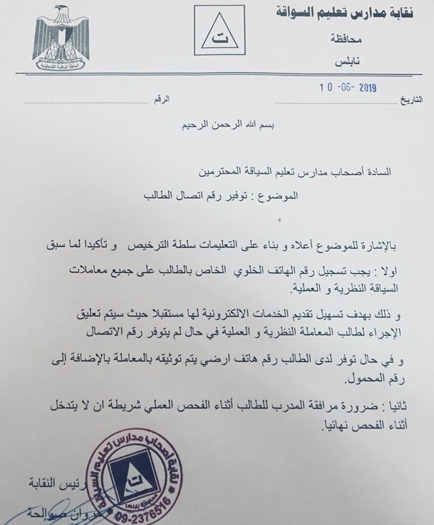 نقابة أصحاب مدارس تعليم السياقة في نابلس تدعو مدارس السياقة إلى توفير رقم اتصال للطالب المتقدم لمعاملات السياقة النظرية والعملية.