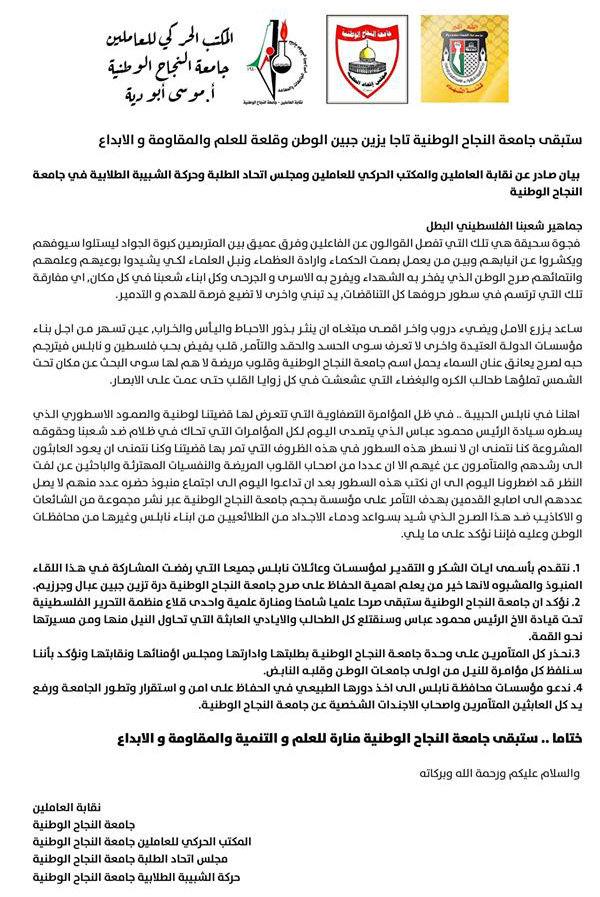 جامعة النجاح تصدر بياناً ضد "متآمرين" وتعلن عن رفضها للشائعات حول الجامعة وإدارتها وتدعو مؤسسات نابلس لأخذ دورها في الحفاظ على أمن الجامعة واستقرارها.