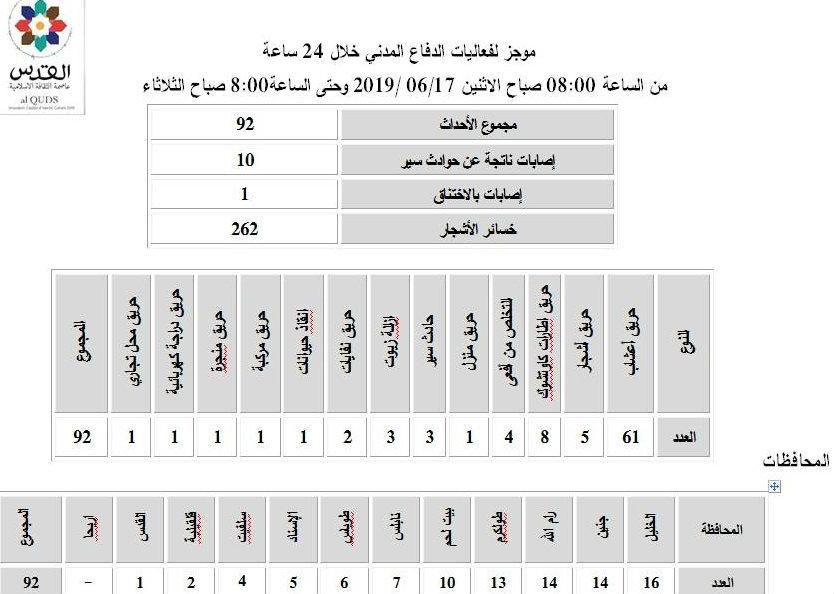 الدفاع المدني ينشر موجزاً لتدخلاته خلال الـ24 ساعة الماضية في محافظات الضفة.