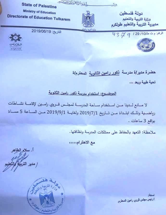 مديرية التربية والتعليم في طولكرم تعطي الإذن بتنفيذ نشاطات رياضية في مدرسة ذكور رامين الثانوية.