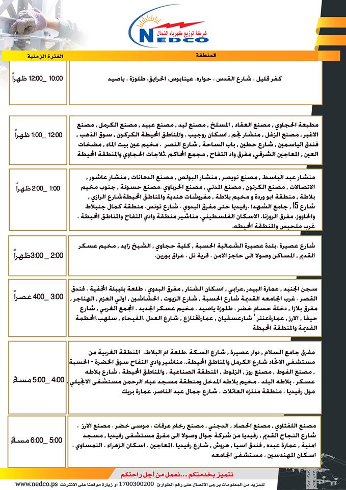 شركة توزيع كهرباء الشمال تنشر جدول فصل الكهرباء عن مدينة نابلس وضواحيها، ليوم الأربعاء 26.06.2019، من الساعة 10 صباحاً حتى 6 مساءً.