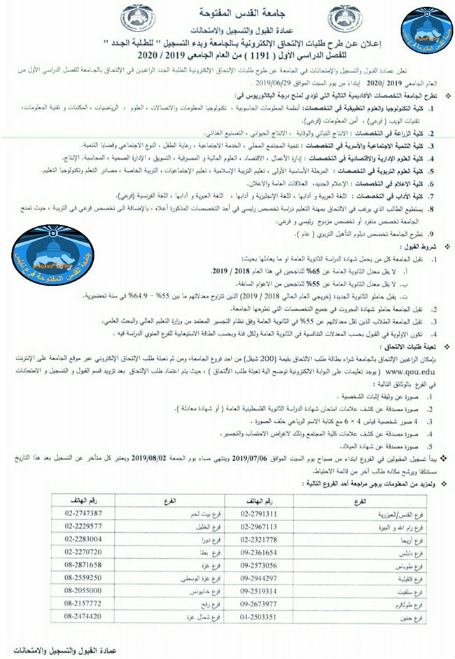 جامعة القدس المفتوحة تعلن عن البدء باستقبال الطلبات الإلكترونية للطلبة الجدد.