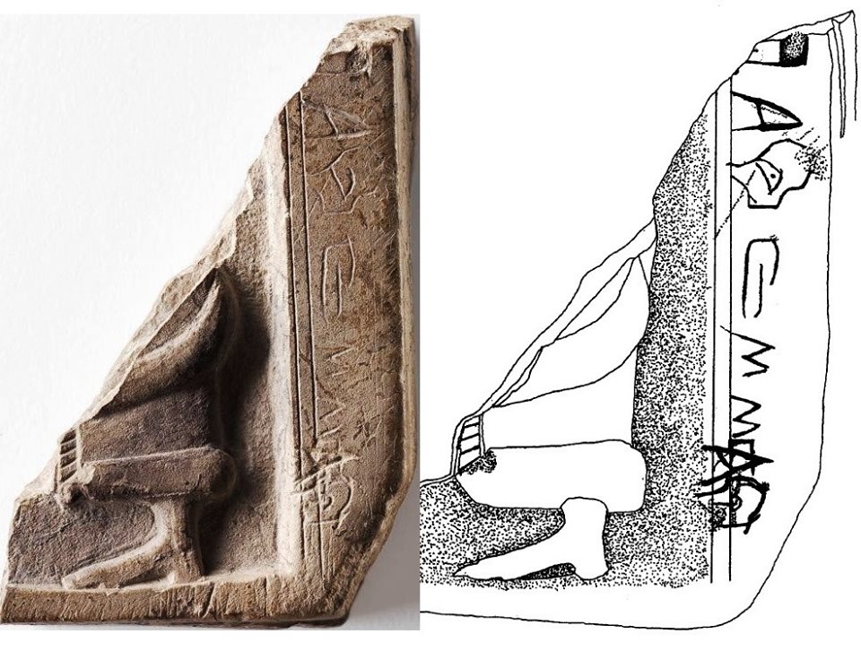 الحرف الذي يليه يشبه راحة يد لكن من دون أصابع. وقد قُرئ بناءً على ذلك كافاً. لكن كل الكافات القديمة، التي تمثل كفا بشرية، فيها خطوط تمثل الأصابع. غير أن بعضهم قرأه فاءً، في حين قرأه آخرون جيماً.