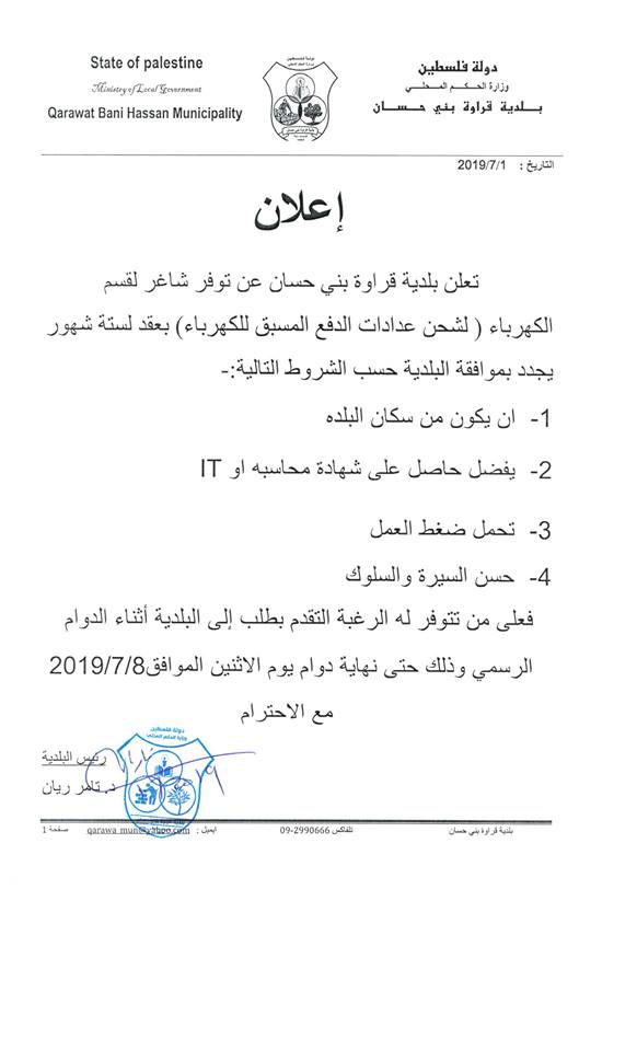 نظراً لقيام الموظف علان حسن سلوم بأخذ إجازة مرضية لعمل عملية قلب مفتوح ترغب بلدية قراوة بني حسان بتعيين موظف بديل بعقد مؤقت لمدة ستة شهور لحين عودته متمنين له العودة بألسلامة والشفاء العاجل.