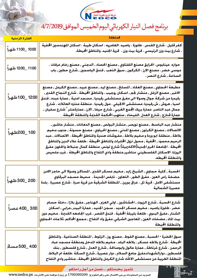 شركة توزيع كهرباء الشمال تنشر مواعيد ومناطق فصل الكهرباء في نابلس وضواحيها ليوم الخميس 04.07.2019، من الساعة 10:00 صباحاً حتى الساعة 05:00 مساءً.