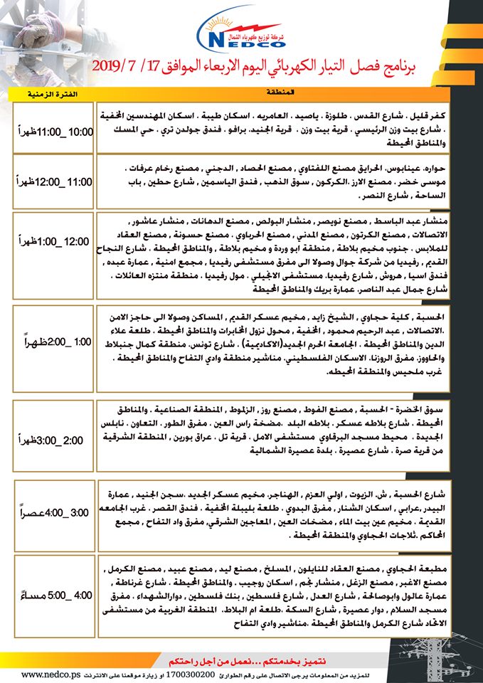 شركة توزيع كهرباء الشمال تنشر مواعيد ومناطق فصل الكهرباء في نابلس وضواحيها ليوم الأربعاء 17.07.2019، من الساعة 10:00 صباحاً حتى الساعة 05:00 مساءً.